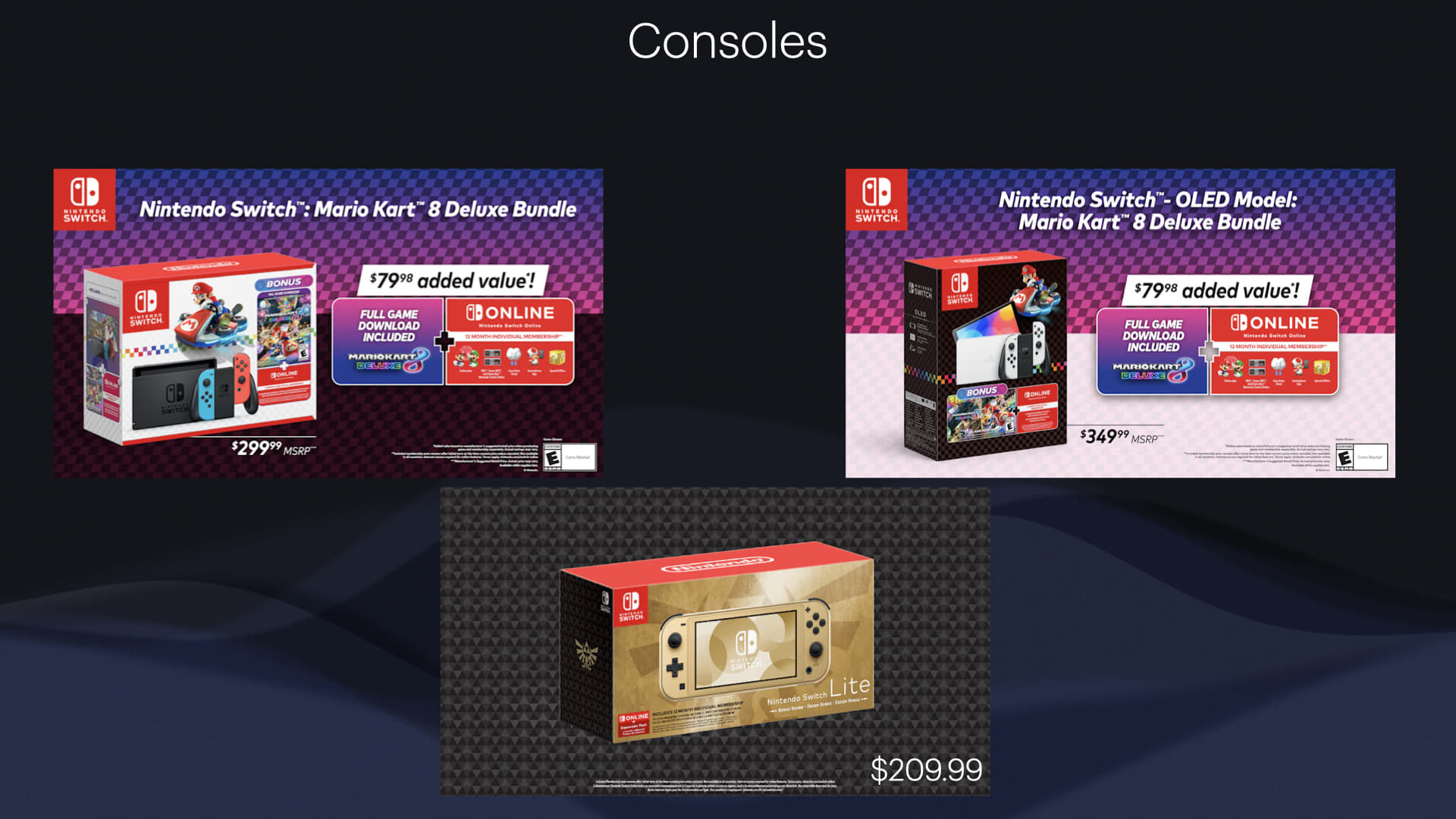 There are two versions of the Mario Kart 8 Deluxe Bundle. The Nintendo Switch Bundle will be $299.99, while the Nintendo Switch - OLED bundle will be $349.99. Both bundles comes with a digital download of Mario Kart 8 Deluxe and a one year subscription to an individual plan of Nintendo Switch Online. Both of these bundles will be available at Target, Best Buy, Wal-Mart, Game Stop, and online at the My Nintendo Store.
