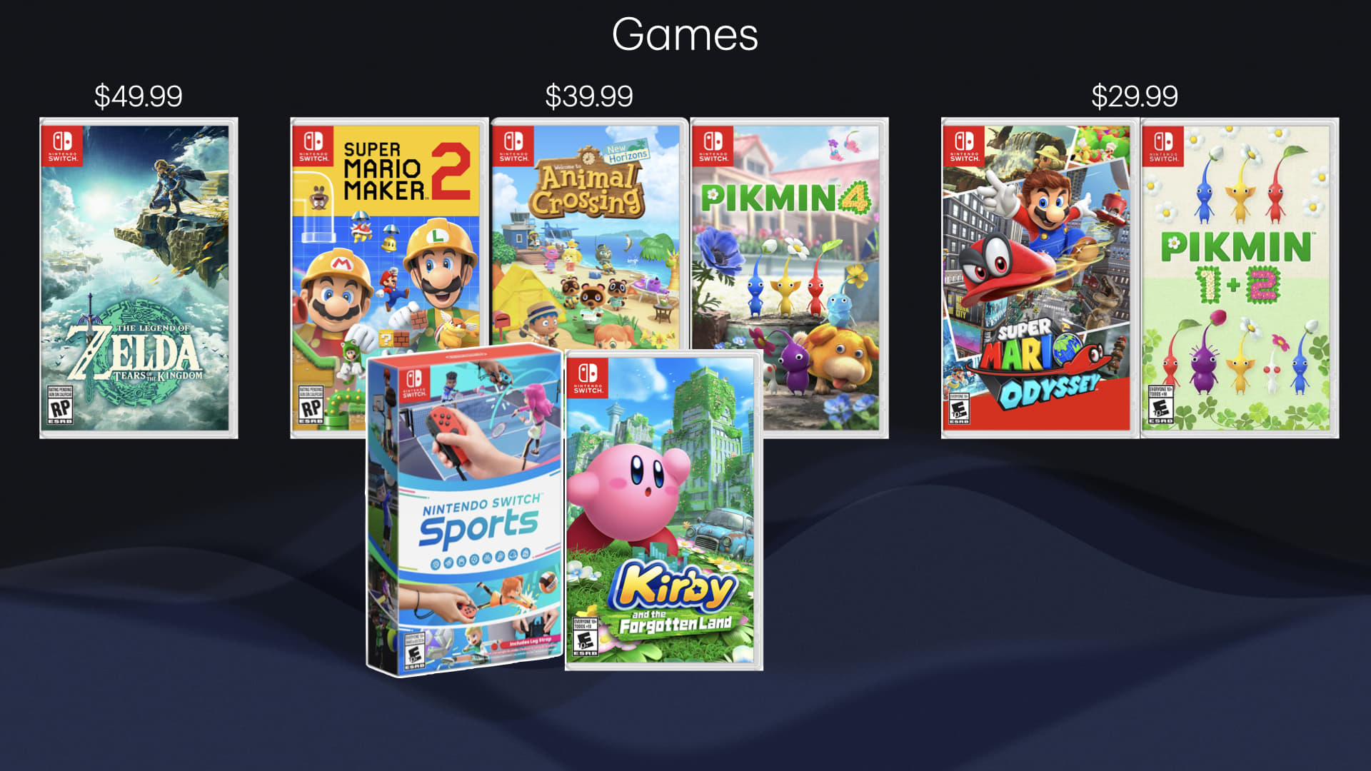 $39.99: Super Mario Maker 2, Animal Crossing - New Horizons, Pikmin 4, Kirby And The Forgotten Land, and Nintendo Switch Sports(Physical)